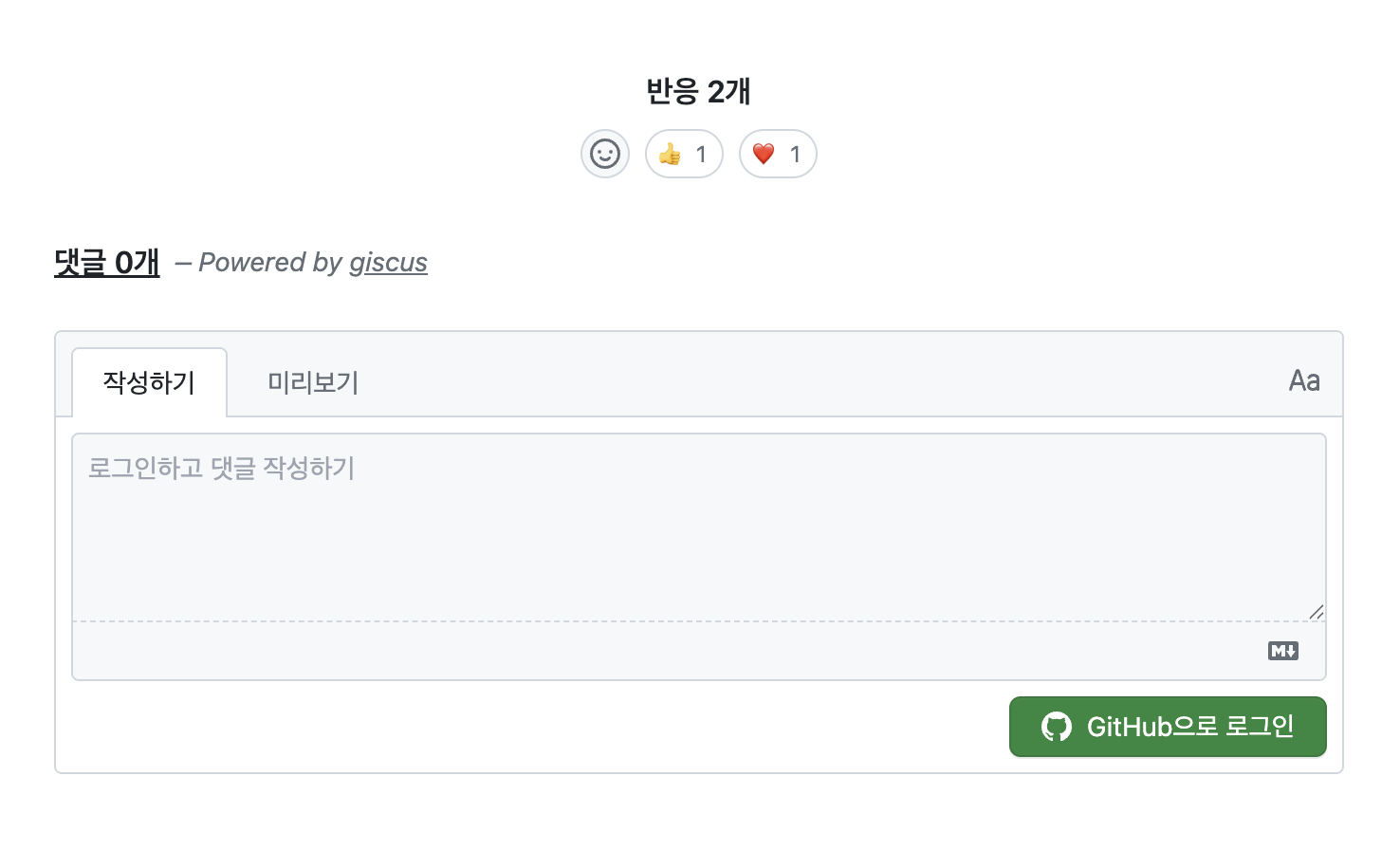 물론 GitHub 계정이 필요하다는 점이 일반 사용자에겐 조금 불편할 수 있지만, 기술 블로그 특성상 대부분의 독자가 개발자일 확률이 높으니 크게 문제가 되지 않을 것 같습니다.