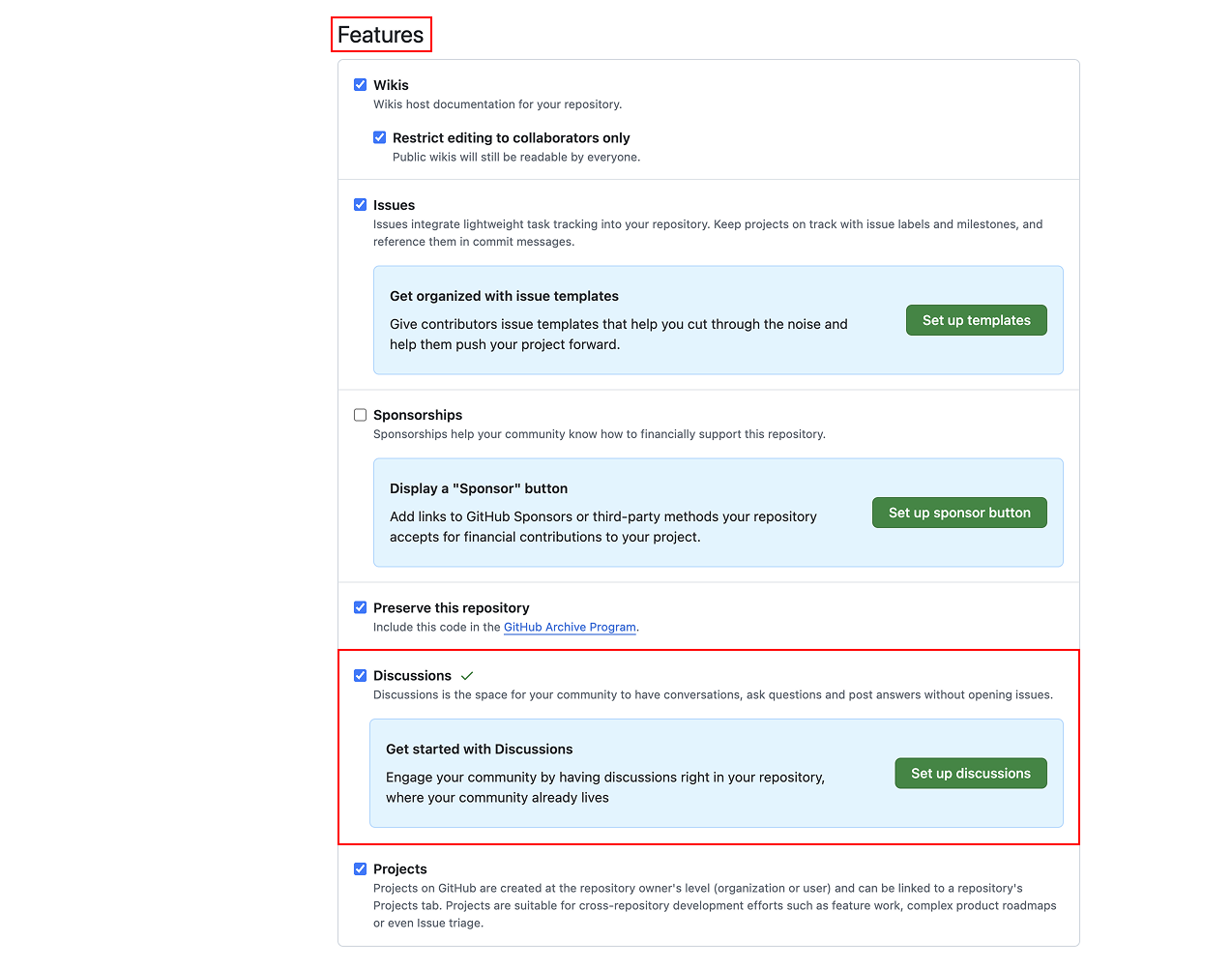 Settings → General → Features에서 Discussions를 활성화해줍니다.
