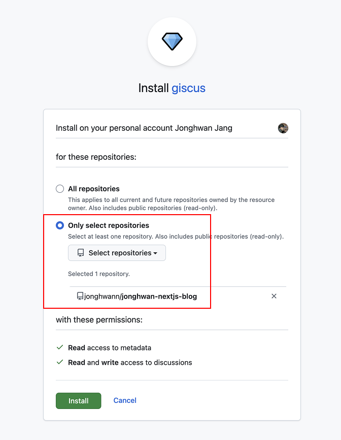 giscus가 굳이 전체 저장소의 권한을 가질 필요는 없으니, 댓글 저장소에 대한 권한만 가지도록 설정해줍니다.