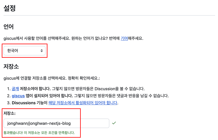 앱 설치가 완료되면 giscus 페이지로 이동해서 댓글 시스템을 설정해줍니다. 먼저 언어를 한국어로 선택한 뒤, 저장소를 연결해주면 됩니다.