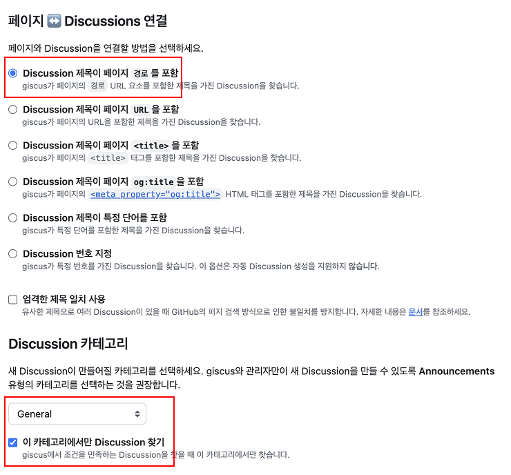그 다음 페이지와 Discussion을 연결할 방법을 선택하는데, 저는 Discussion 제목이 페이지 경로를 포함 옵션을 선택했습니다.