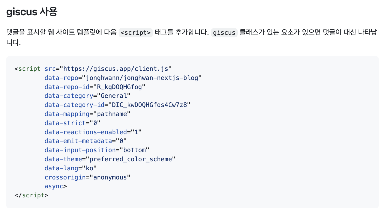 앞서 giscus 설정 페이지에서 생성된 script 내 데이터를 아래 표시된 부분에 넣어주면 됩니다.